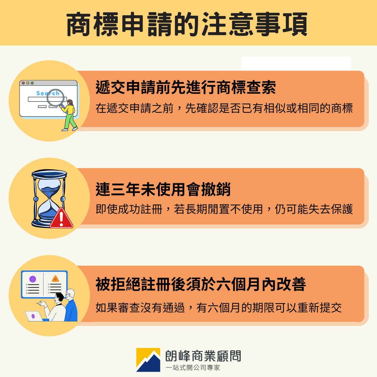 【朗峰商業顧問】團隊擁有多年經驗,幫你節省人力和時間,我們會從文件準備、服務分類、審核及公告等流程一路陪跑,確保申請順利完成。馬上預約諮詢,讓你的品牌擁有穩固的法律保護。